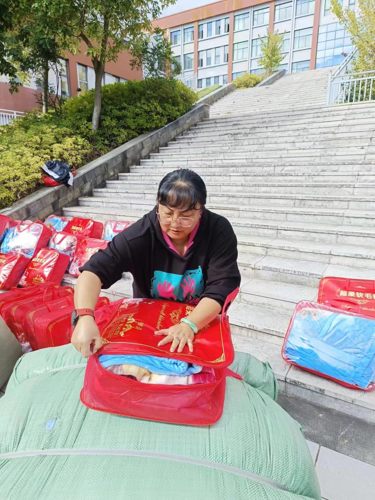 物资发放现场,学院党总支书记王春莲带头整理、核对物资,亲手将一条条毛毯递到受助学生手上,并热心了解受助学生的学习、生活情况。她鼓励所有受助学生要保持积极乐观的生活态度,珍惜大学时光,有困难第一时间向学院反映,学院定会积极帮助大家解决问题。