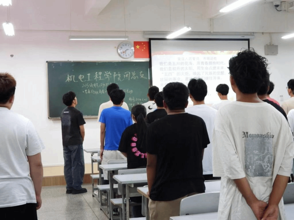 活动伊始,全班同学在心理委员董学斌的带领下重温入团誓词,齐唱团歌。同学们精神饱满、激情昂扬,展现出了机电学子的蓬勃朝气和对祖国深深的热爱。