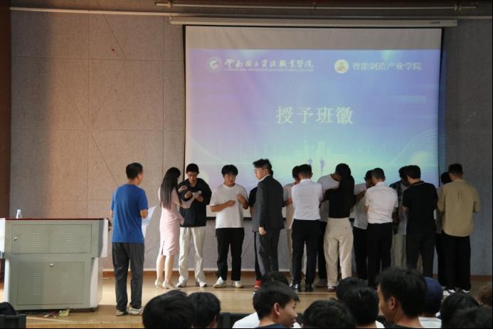 樊鹏奋副主任向同学们介绍了《智能制造在秀洲》,他提到嘉兴秀州的人文风景、地理位置、城市特色等,还介绍了订单班所享受的福利,展示了第一届订单班学生的履历。