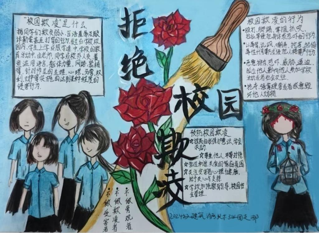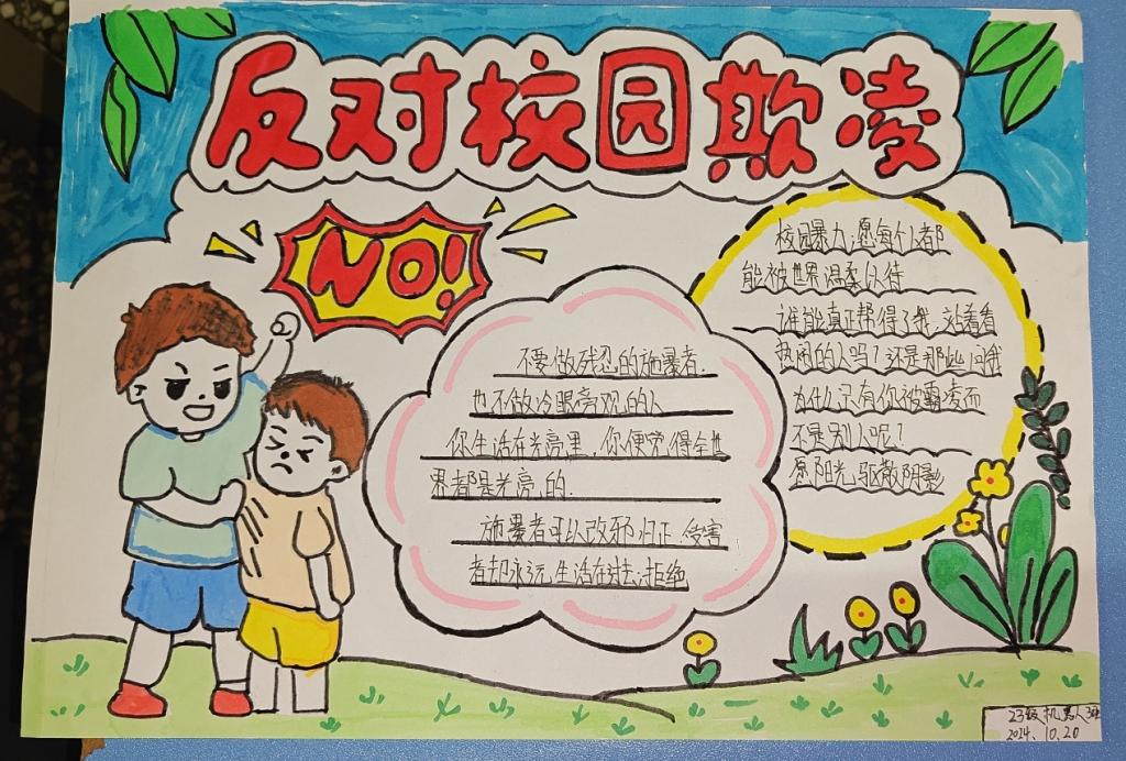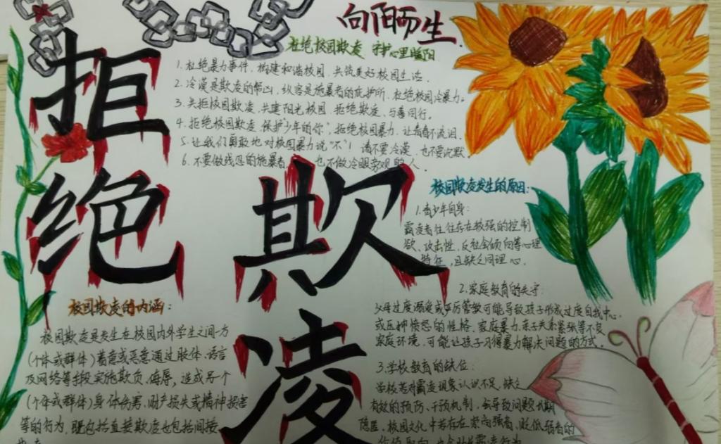 此外,在“防校园欺凌 守成长净土”主题活动中,通过组织观看校园欺凌电影和制作手抄报等形式,让同学们了解校园欺凌的特征,树立是非观念,抵制校园欺凌,为构建平安和谐的校园环境奠定了基础。