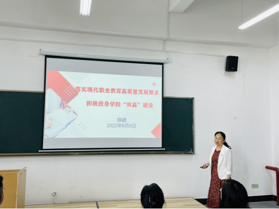 6月8日下午,党委副书记、校长陈颖以《落实现代职业教育高质量发展要求 积极投身学校“双高”建设》为题,结合BEAT365英国官网的实际情况,给BEAT365英国官网全体教职工讲授“双高”建设专题党课,BEAT365英国官网党总支书记王春莲主持。