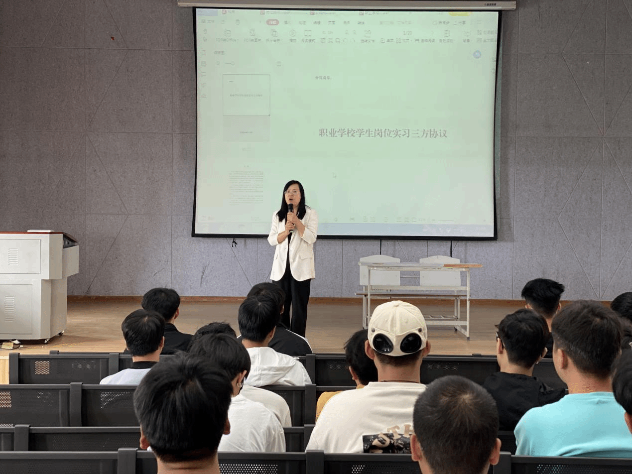 会议伊始,院长张俊妍老师指出,此次实习的目的是为了让同学们提前适应社会工作,学习企业文化,在实习期间,要时刻关注学校的相关通知和具体的教学安排,按质按量按时完成相关教学任务。她结合身边的实际案例,希望同学们做到以下几点:一是做好职业生涯规划,要认真完成学业,在内不忘学生身份,在外不忘员工身份,自觉遵守学校和企业的要求和规定,管理好自己,履行相关义务。二是要增强安全防范意识,牢固树立自己是自身安全责任第一人,注意交通安全,认真参加岗前培训,遵守公司的安全生产规章制度。三是要转变认识,正确看待职业教育和基层就业,全面客观地分析就业和专升本,要珍惜到企业学习的机会,努力提升自己的专业技能,在未来的就业岗位中书写属于自己的壮丽人生。